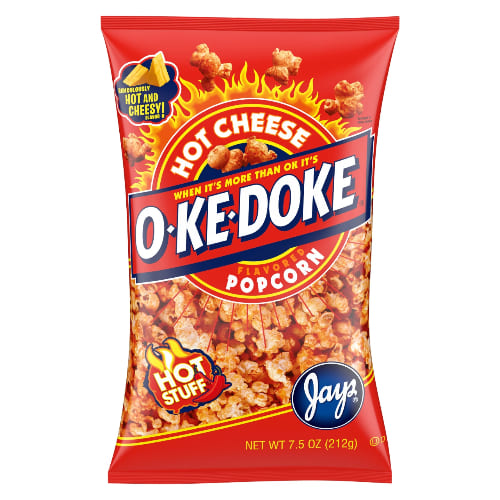O-Ke-Doke offers a variety of flavors including classic Cheese Popcorn, Buttery Popcorn, Hot Cheese Popcorn, and White Popcorn, as well as the popular Chicago Mix which combines cheese and caramel corn.